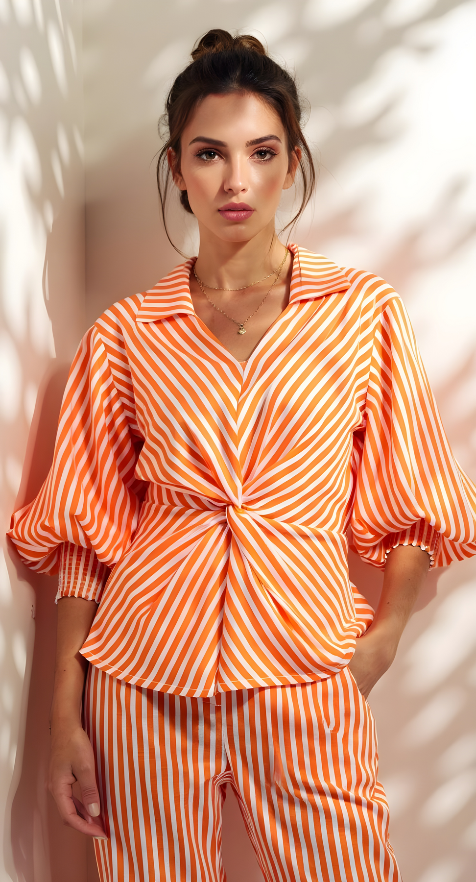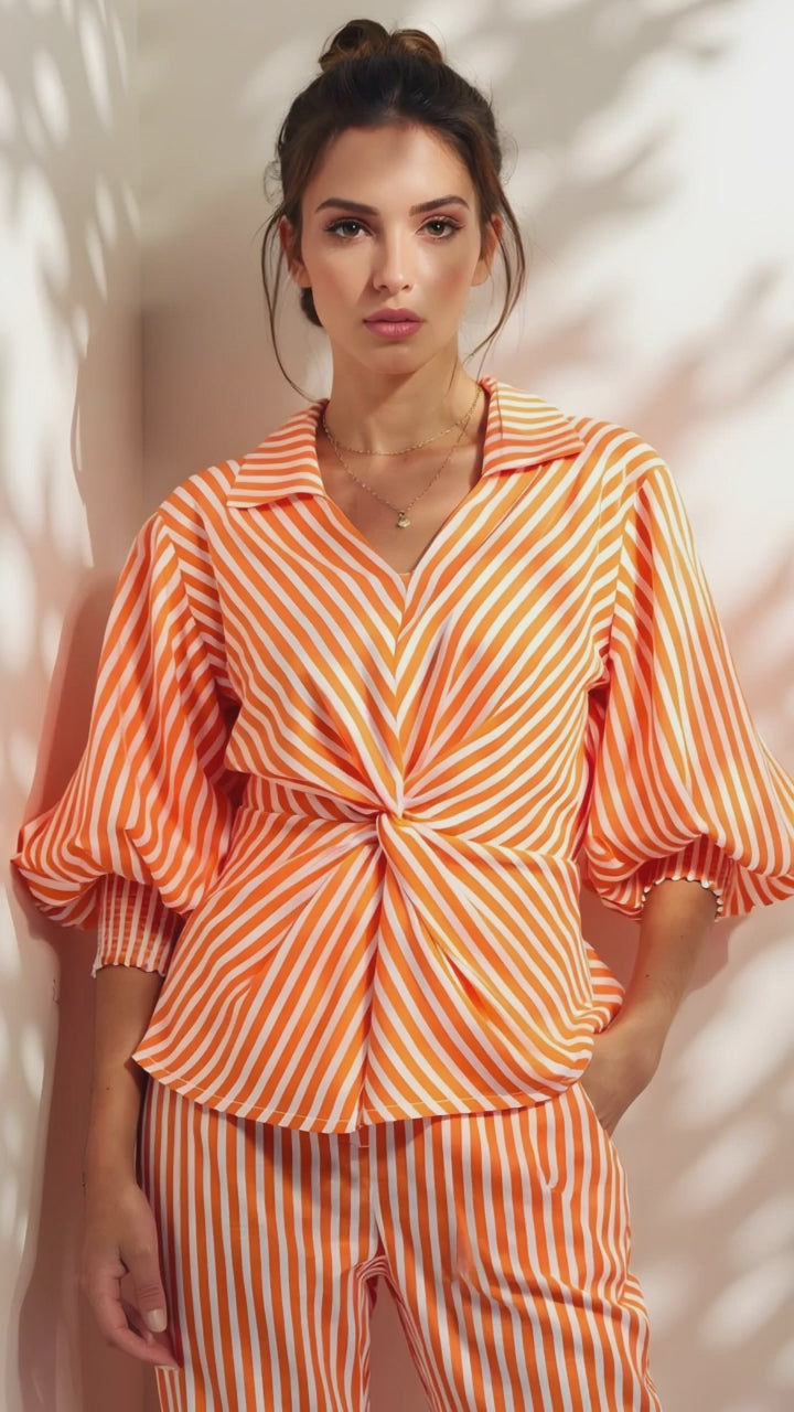 Blusas con detalle de nudo en el centro, cuello camisero, escote v y mangas 3/4 abullonadas.