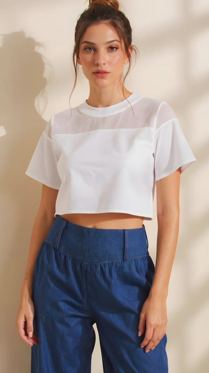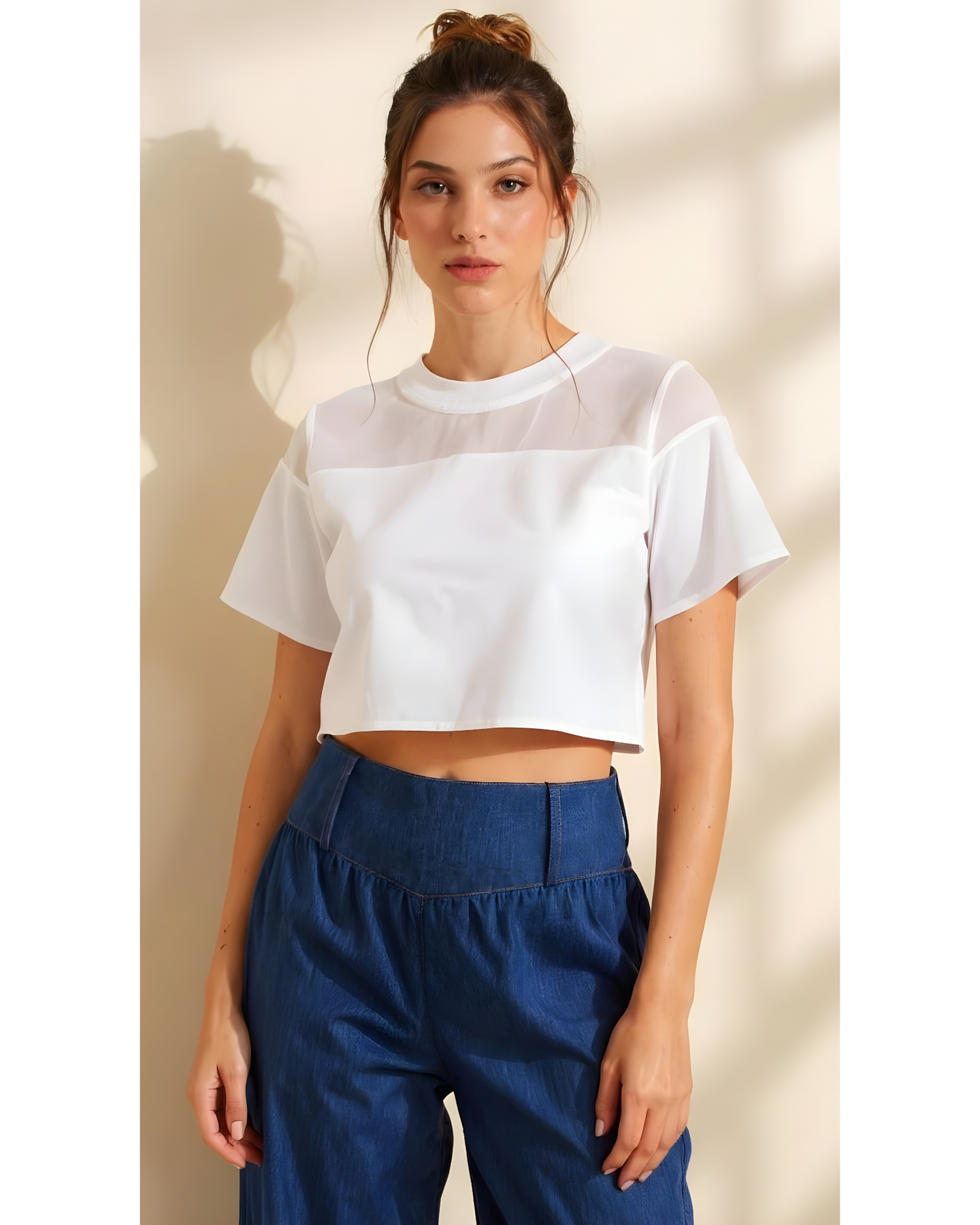 Blusa manga corta con corte de transparencias y espalda tulipan