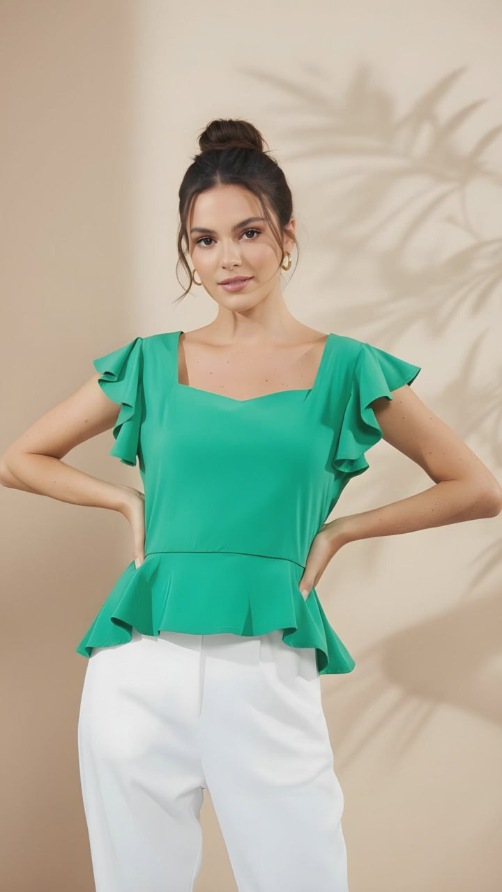 Blusa entallada escote corazon, con vuelo en la cintura y detalle de mangas acampanadas.