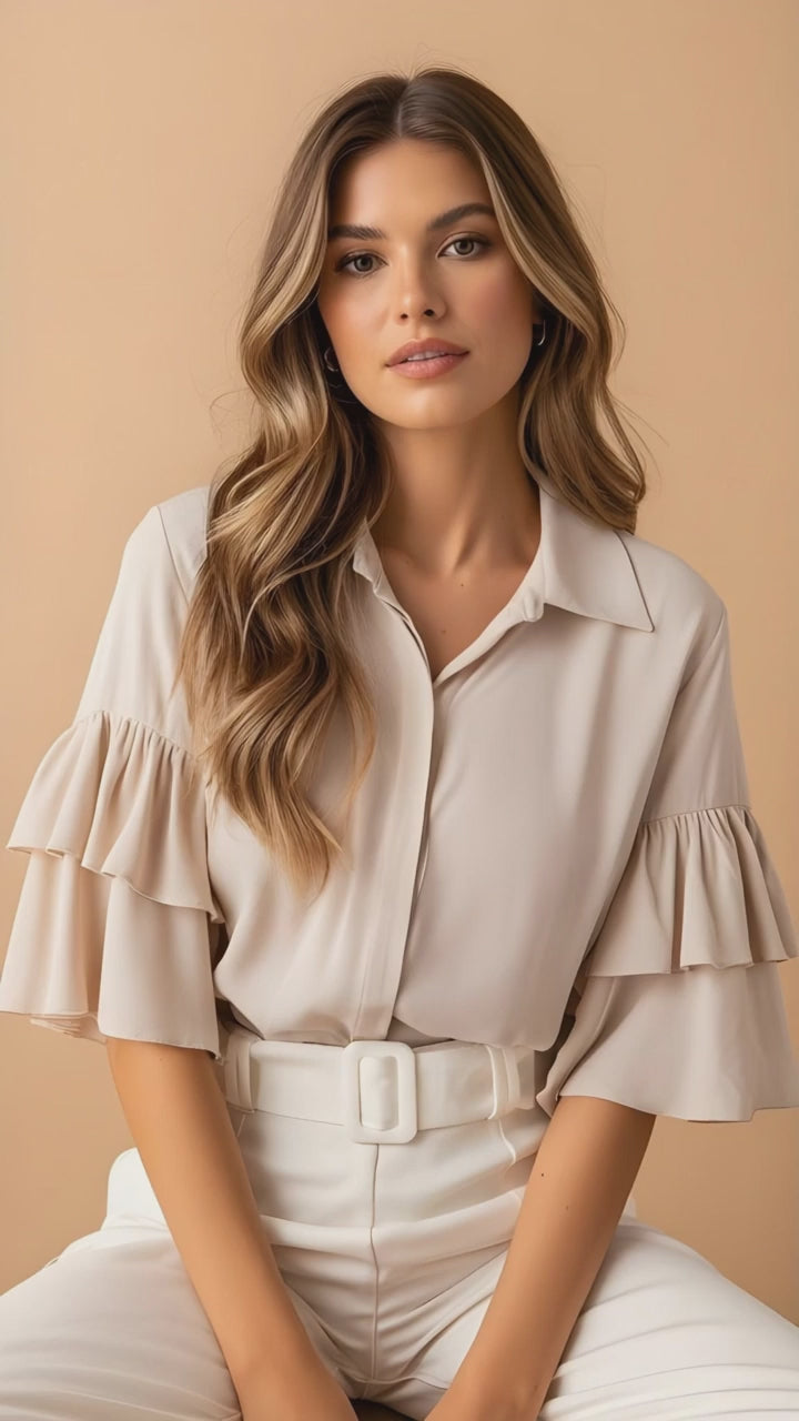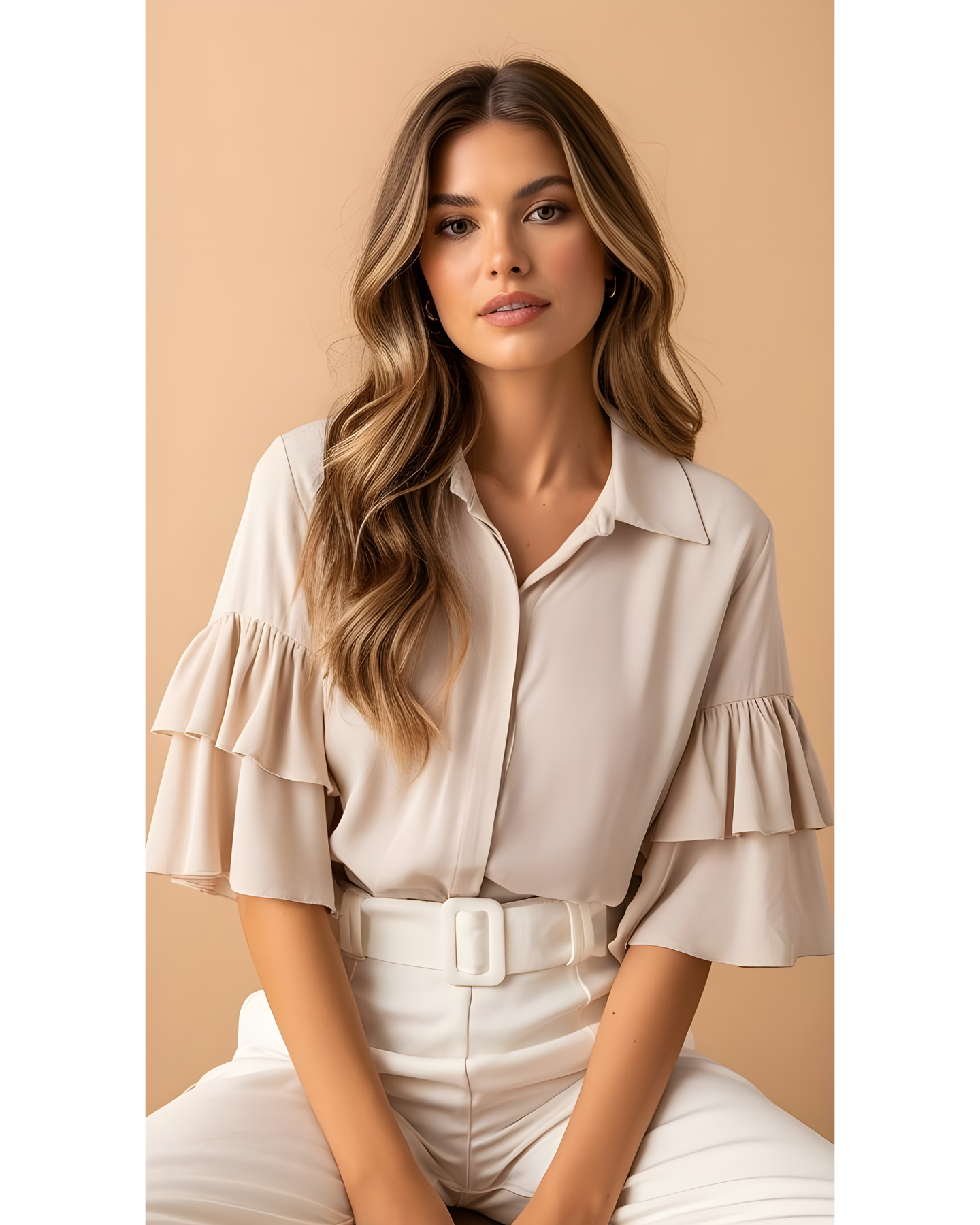 Blusa ligeramente oversized, cuello camisero, botonadura invisible y manga doble campana.