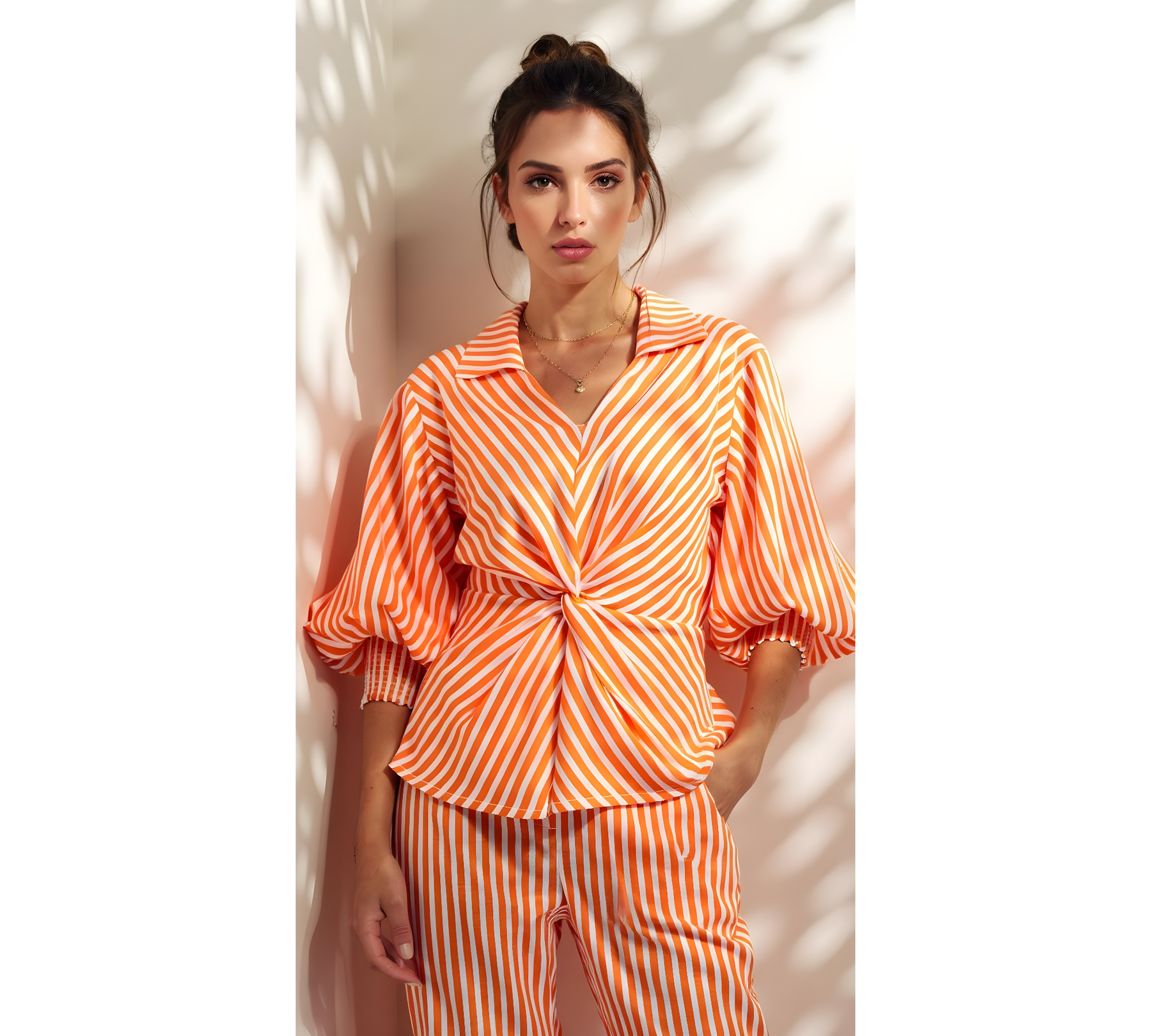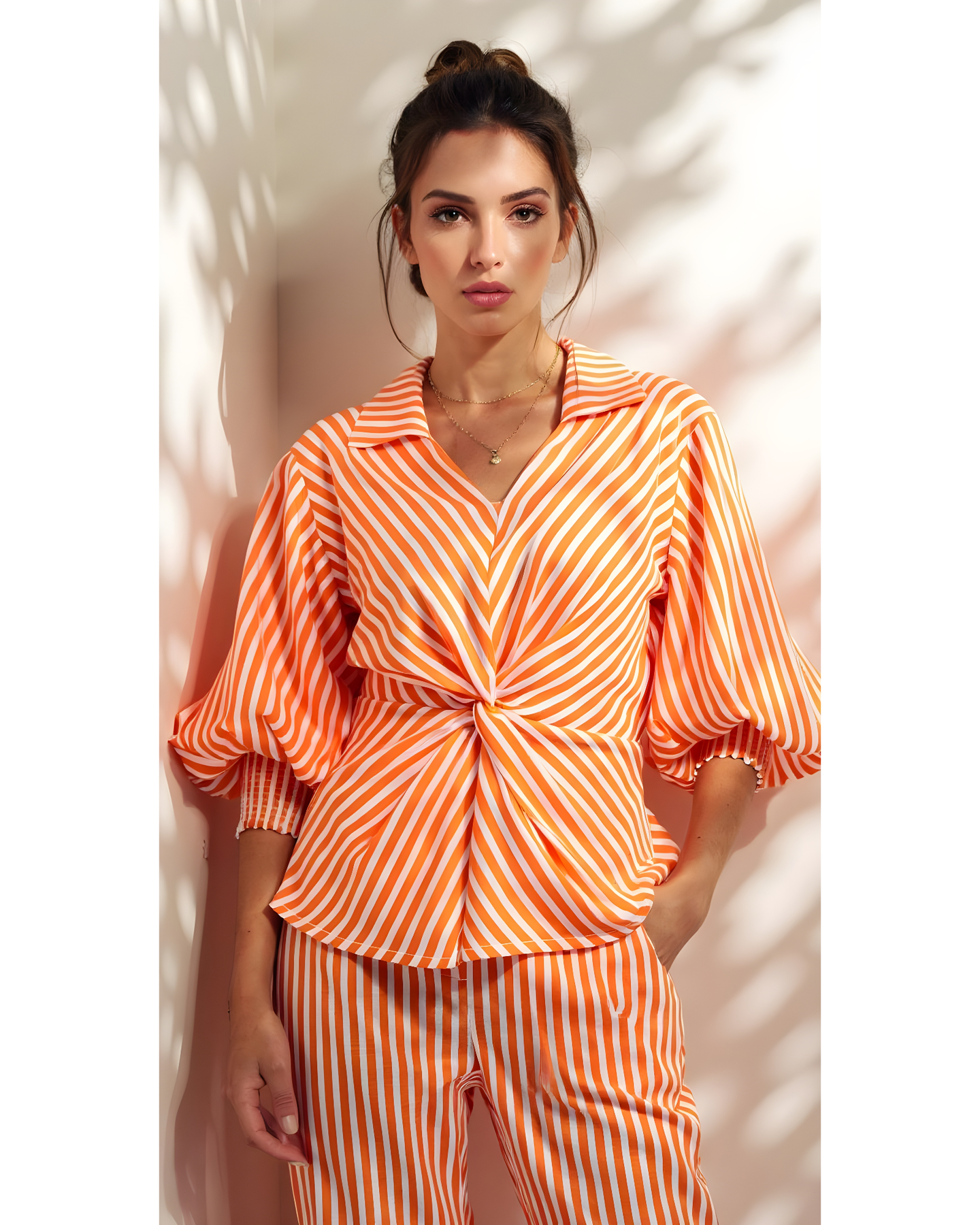 Blusas con detalle de nudo en el centro, cuello camisero, escote v y mangas 3/4 abullonadas.