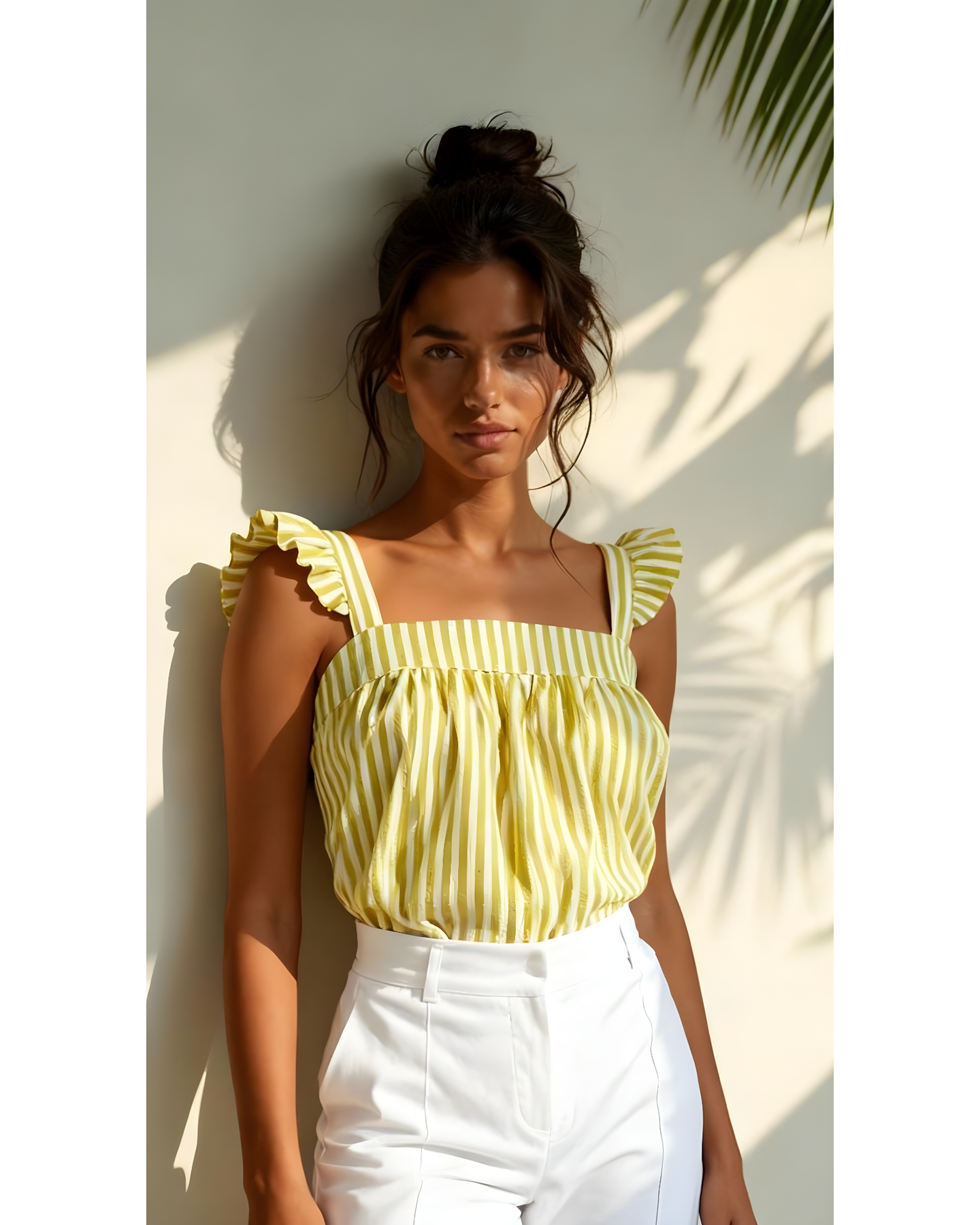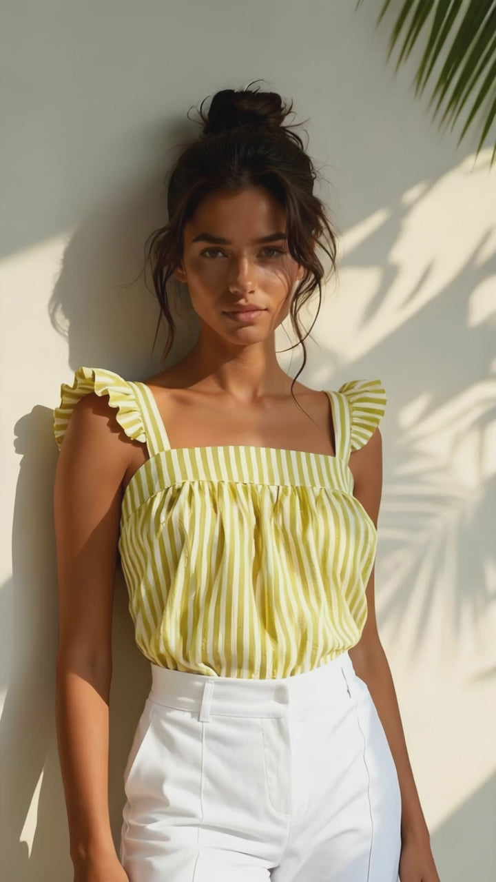 Blusa escote cuadrado con detalle de bobitos en los hombros, con un nudo en la espalda.
