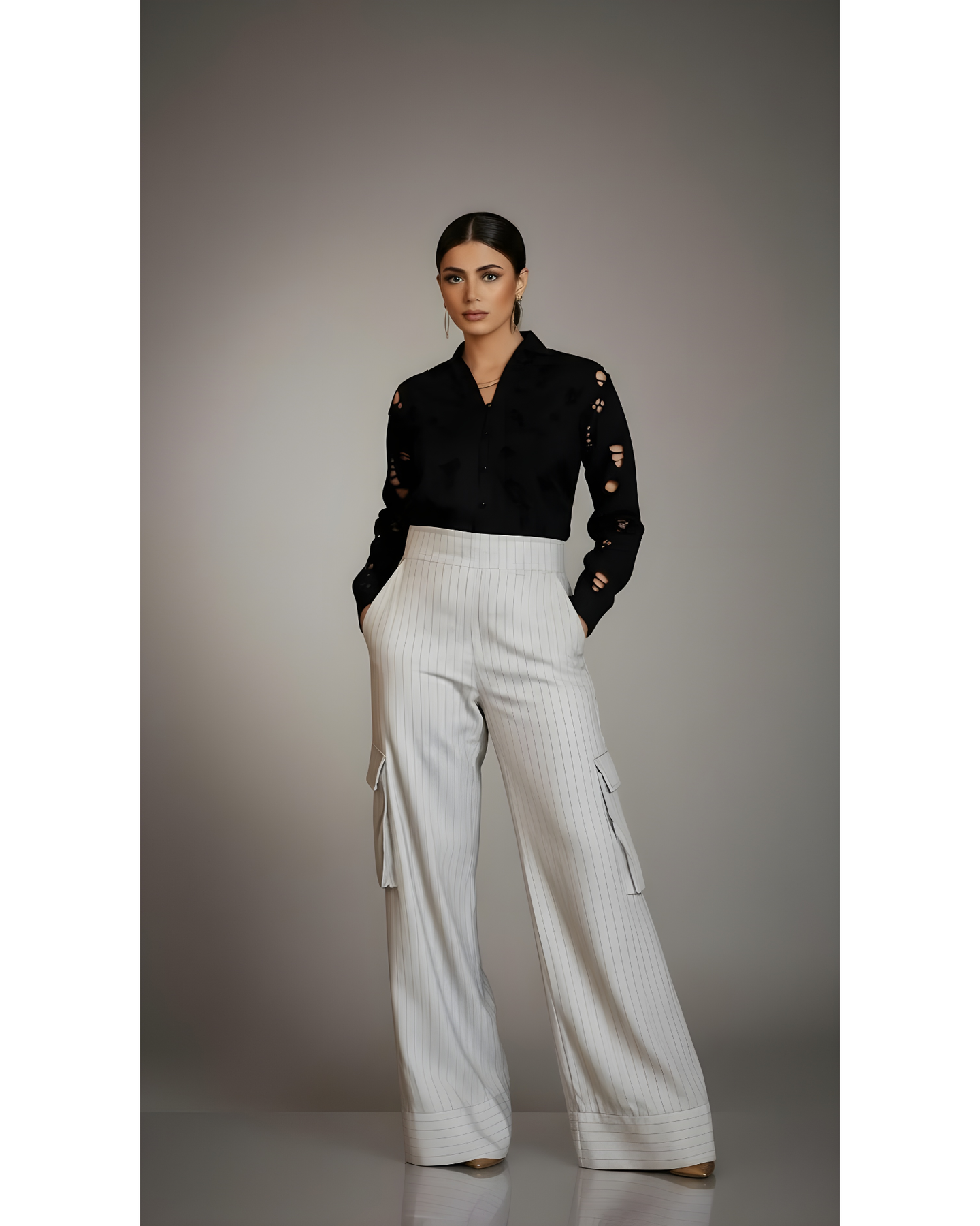 Modelo tipo cargo pero con detalles únicos que elevan la prenda, tiene tiro alto y cierre en la parte de atrás, pretina ancha y un detalle precioso en la bota de la manga. Este pantalón podrás usarlo con los zapatos de tu preferencia.