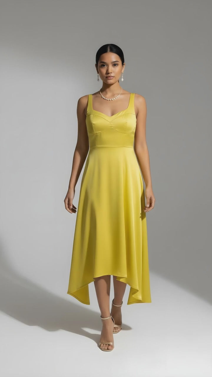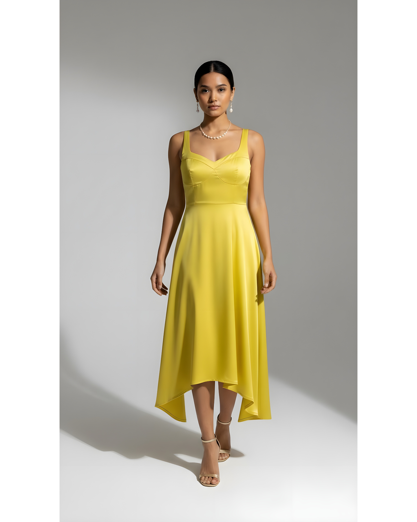 Vestido de tiras con un top tipo corset, falda con corte mas alto en la parte central y mas largo en los laterales. Un vestido super fresco y elegante.