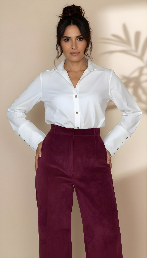 Blusa cuello camisero, manga larga con detalle de puño ancho, fit ligeramente oversized y en la espalda canesú con detalle de pliegue de encuentro.
