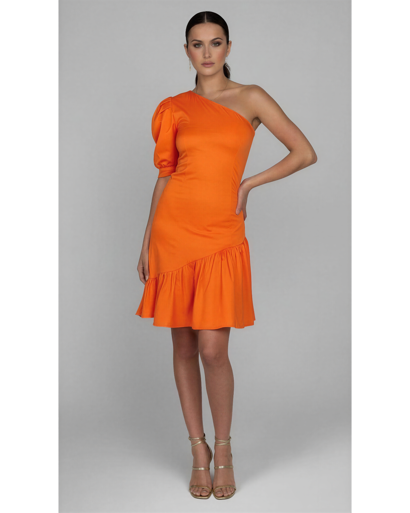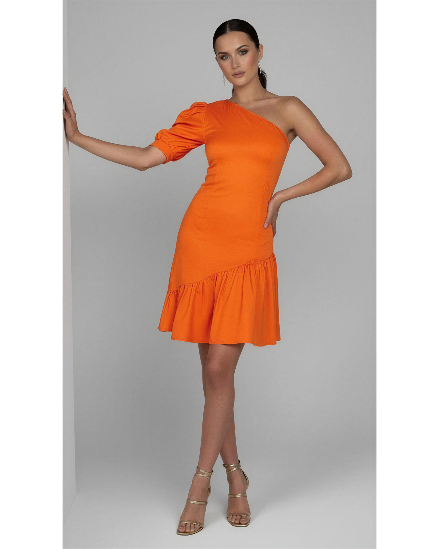 Un vestido que ilumina. Diseño asimétrico de un solo hombro, manga abullonada, y un corte especial que estiliza la cintura y cae en un vuelo femenino y elegante.