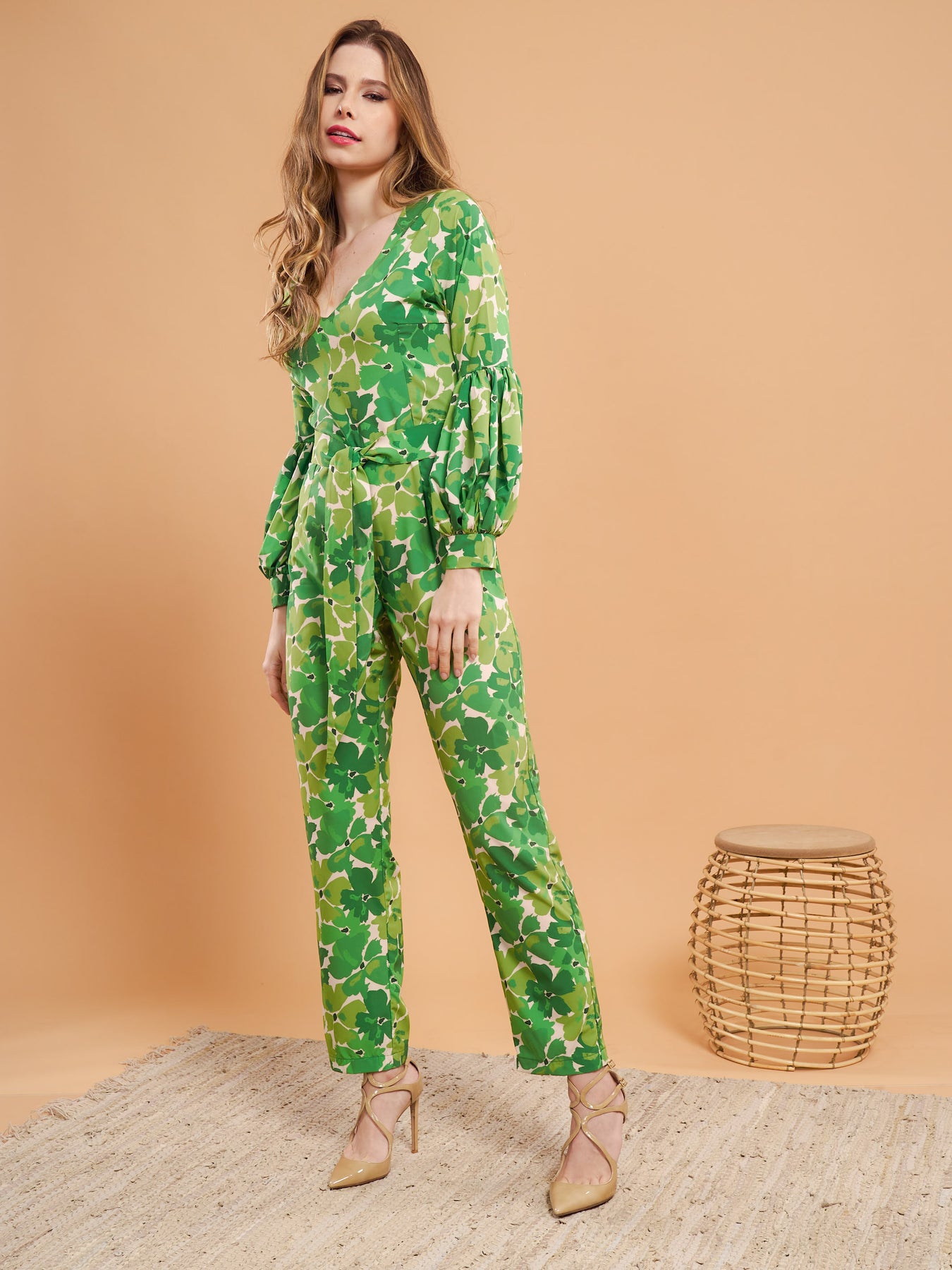 Enterizo escote V, fit entallado, manga larga con detalle de abullonado desde el codo hasta el final de la manga, en la parte inferior pantalón recto y en la espalda un cierre invisible.