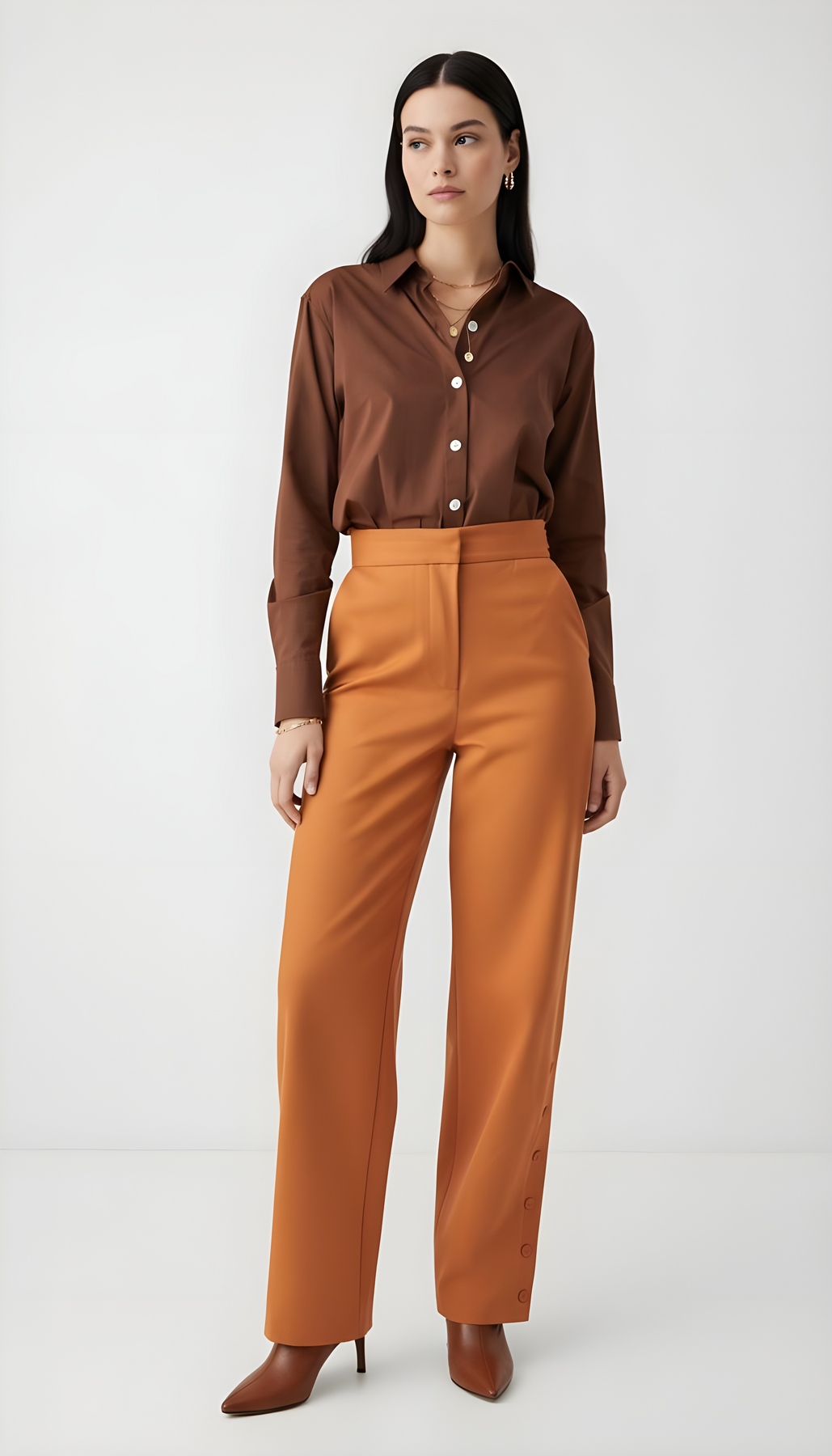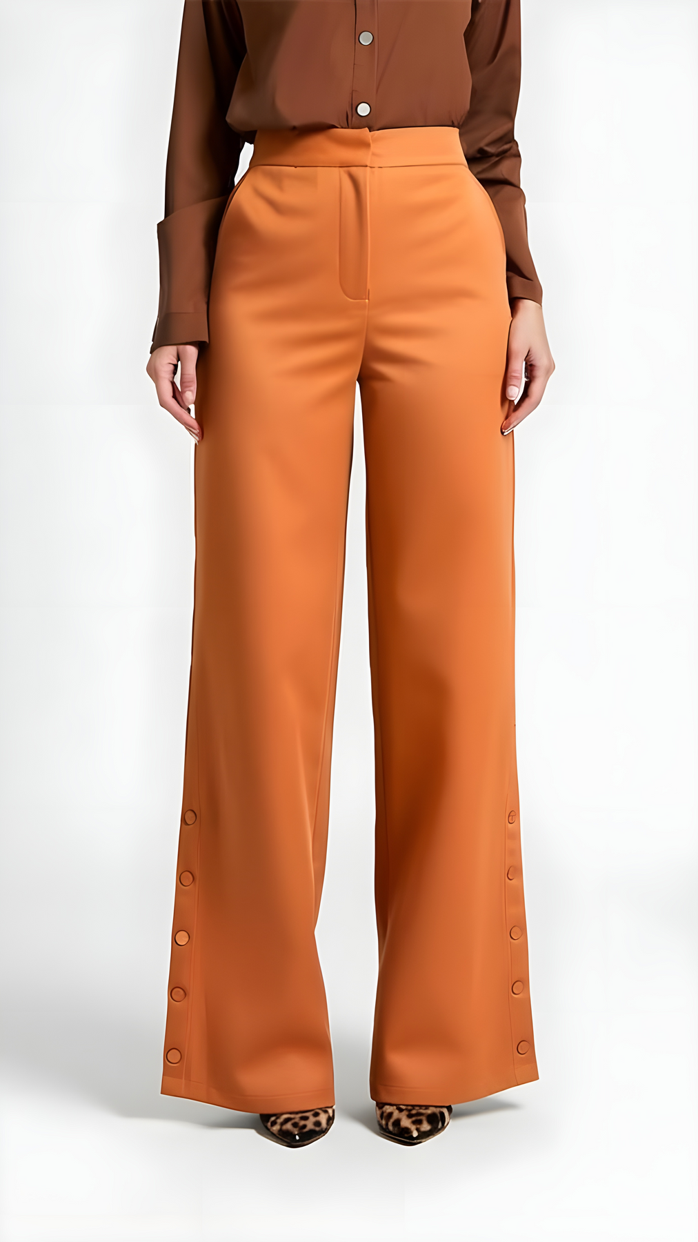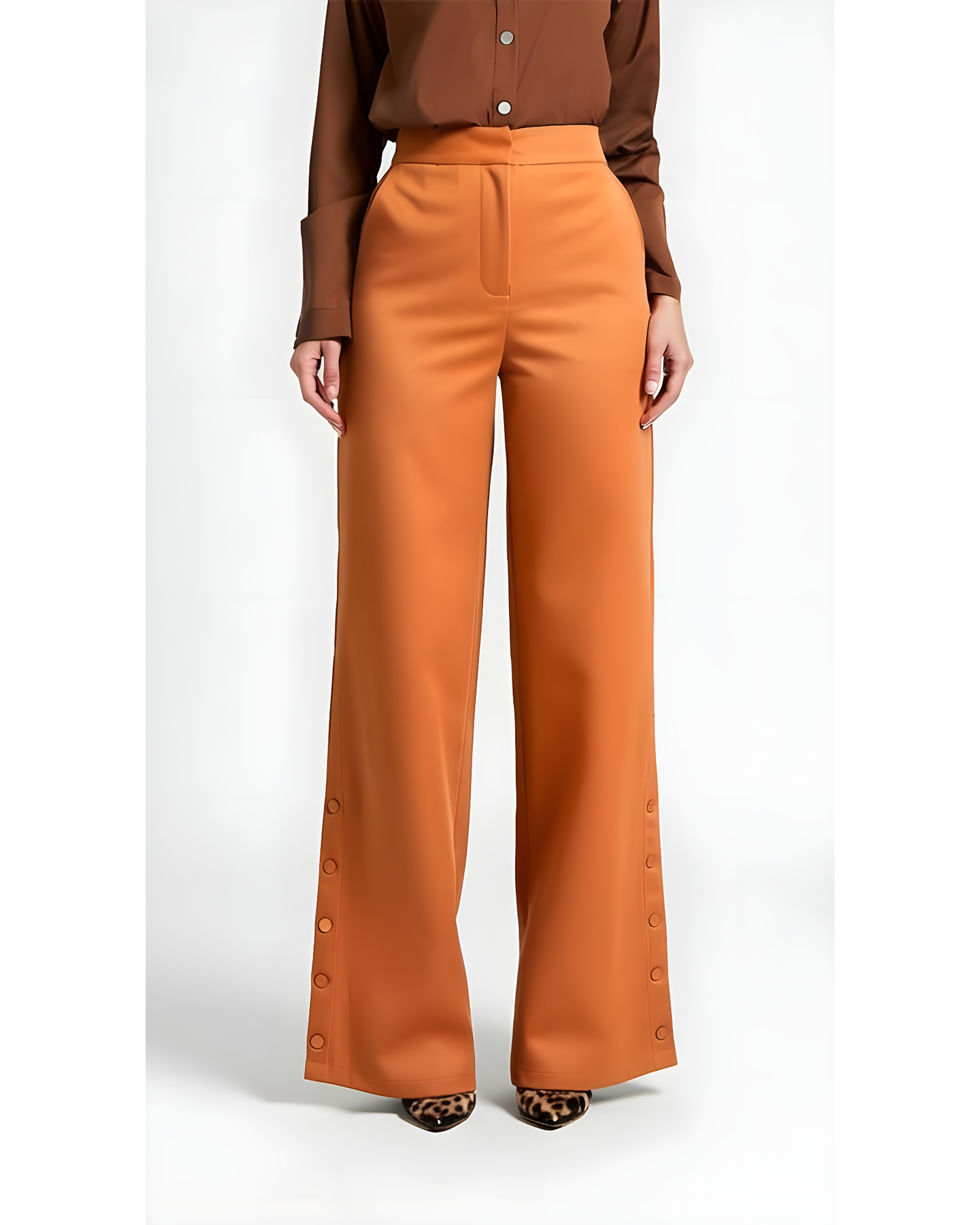 Pantalón a la cintura con pretina en todo el contorno y cierre en la parte delantera con broche oculto; detalle de botones laterales a los costados de la basta.